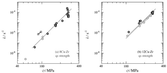 Quasi-stationary strengths of (a) 8Cu-Zr (symbols from Figure 7) and (b) 12Cu-Zr; grey dotted lines connect data from the same test.