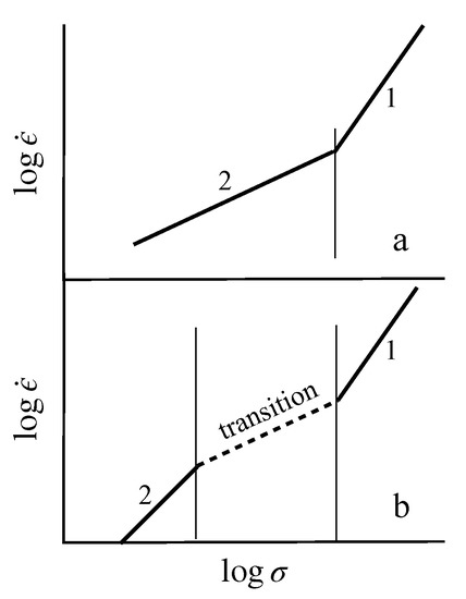 The aim of the present work is to learn more about the influence of the grain structure on the qs strength. As shown above, the high value of has a softening effect (Section 3.1) and leads to a relatively high rate sensitivity (equivalent to low stress sensitivity ) of the qs strength (Section 3.4). The qs stress exponent and a high activation energy remind one of the power laws of steady state creep that are explained by specific mechanisms of qs creep, characterized by a certain stress exponent and rate sensitivity (see, e.g., [19,20,21]). For example, mechanisms 1 and 2 in Figure 13a might represent climb-controlled steady state creep and superplastic deformation, respectively. Following this approach, the power law range in Figure 12 would correspond to some mechanism 2.