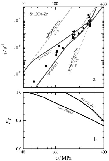 - The qs strength of subgrain-free grains is quantified by the relationfrom [27]; the f-factors were set to 0.19 (f-factors apply in the limiting case where all dislocations are lying at HABs, all are in dipolar configuration ready for recovery, and have unrelaxed stress fields; as this is unrealistic, f-values distinctly less than 1 are sensible). This choice yields the two dashed grey lines in Figure 14a for the present and the limiting assumptions of equal stress (iso-stress) or equal strain rate (iso-rate) in all grains.