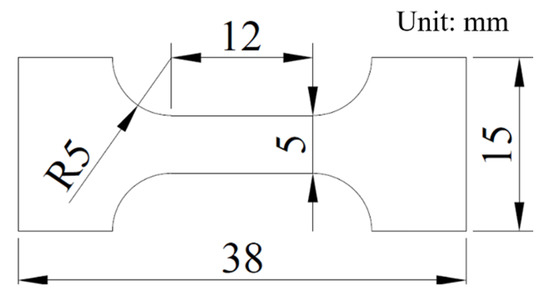 Room temperature tensile tests with a constant strain rate of 0.01 s−1 were conducted on an Instron-5967 universal testing machine (Instron5967, INSTRON, Boston, MA, USA). Each set of tensile tests was performed four times to establish reproducibility.
