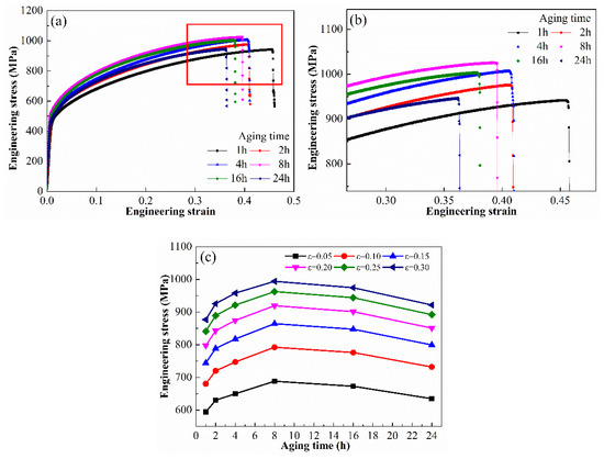 Figure 5a showed the engineering stress–engineering strain curves of GH4169 alloy. It can be seen that the elastic strain of the alloy was small, and the yield of the alloy was reached at a small strain. The flow stress of the alloy showed a clear upward trend with an increase in plastic strain, which was due to work hardening during plastic deformation. Figure 5b shows an enlarged view of the red framed portion in Figure 5a. For a given engineering strain, as the aging time increased from 1 h to 24 h, the flow stress of the alloy first increased, and then the flow stress decreased, which is related to the volume fraction and morphology of the δ phase (Figure 5c).