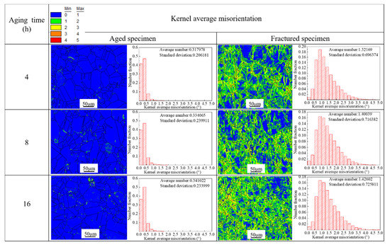 KAM of the alloy measured for the aged specimens and fractured specimens at different aging times.