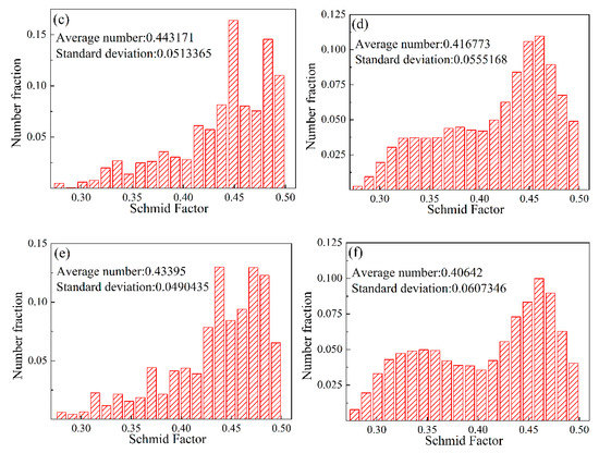 During the plastic deformation process, the roughness of the specimen’s surface changed significantly, which was closely related to the crystallographic orientation [28]. The crystallographic orientation with regard to the applied stress controlled the plastic strain, which was produced inside each grain [29]. The crystallographic orientation could be characterized by the Schmid factor. Grains with a low Schmid factor were deformed with difficulty, while the greater number of hindrances and grains with a high Schmid factor were easily deformed due to fewer hindrances. Figure 8 displays the Schmid factor maps of aged specimens and fractured specimens at different aging times. It can be observed that the Schmid factor values of each grain in the aged specimens were different (Figure 8a,c,e). Compared with the aged specimens, the Schmid factor values of the fractured specimens decreased (Figure 8b,d,f). This indicates that the Schmid factor values of the grains gradually decreased during plastic deformation, and the deformation of the grains became more and more difficult.