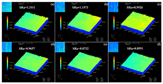 Surface roughness of the deformed specimens with various aging times under the condition of a strain of 0.2. (a) 1 h; (b) 2 h; (c) 4 h; (d) 8 h; (e) 16 h; (f) 24 h.