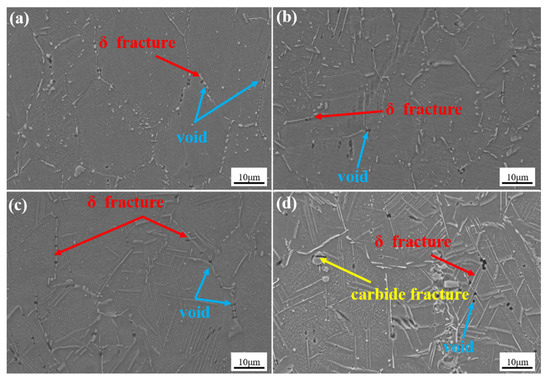 The matrix γ phase contained non-metallic inclusions, precipitates, or brittle phases. The mechanical properties of these materials were very different from those of the matrix γ phase. When plastic deformation occurred, the slip would preferentially start along the slip surface of the matrix γ phase. However, these materials with different phase components in the matrix γ phase hindered the motion of the dislocations, resulting in the accumulation of dislocations in the vicinity of the non-matrix phase and resulting in local stress concentration. The voids formed in the vicinity of the δ phase in Figure 10 were caused by the stress concentration due to dislocation accumulation during plastic deformation. As the plastic deformation of the alloy continued, the stress value at the δ phase was greater than its own strength or exceeded the interface strength between the matrix γ phase and the δ phase, which caused a void to form in the matrix γ phase, and the position of the δ phase usually became a void initiation position. The presence of the δ phase causes a large number of voids to nucleate near the δ phase, thereby promoting the formation of voids during tensile deformation. Therefore, as the volume fraction of the δ phase increases, the εf of the material gradually decreases.