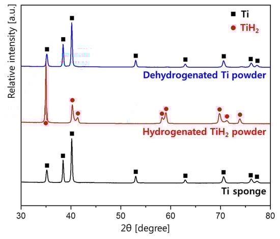 Figure 2 shows the XRD patterns of the initial Ti sponge, the hydrogenated TiH2 powder, and dehydrogenated Ti powder. Initially, the Ti sponge had α-Ti phase with a hexagonal close packed structure, and after the hydrogenation annealing, it was transformed to TiH2 phase. Thereafter, brittle TiH2 was pulverized to powders and hydrogen was removed through annealing in a vacuum atmosphere. The XRD result after the dehydrogenation annealing confirmed that all hydrogen was removed and the crystal structure was returned to the original α-Ti phase.