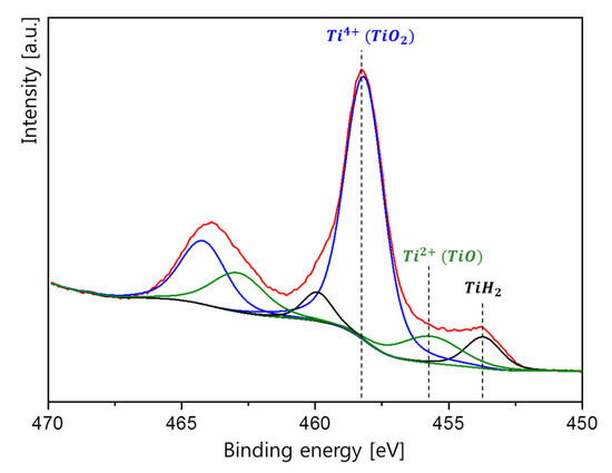 As shown in Figure 4, the oxide layer had two oxidation states: Ti4+ and Ti2+. The strong peaks at 464 and 458 eV were observed in the spectrum. These peaks are attributed to Ti 2p1/2 and Ti 2p3/2, which is related with the 4+ oxidation state of Ti [20,21,22]. Minor peaks were observed at 455.5 and 453.5 eV, respectively, indicating Ti2+ and TiH2 states exist [21,22]. As Ti4+ and Ti2+ states indicate the presence of TiO2 and TiO oxide, it can be concluded from the XRD result that TiO2 oxide was mainly formed with a small amount of TiO oxide when the oxide layer was formed on the TiH2 during the milling process.