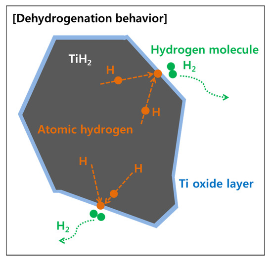 The oxide layer, as the cause of the increased oxygen concentration, was reduced during the dehydrogenation reaction, as shown in Table 1, suggesting that a reduction reaction for the oxide layer occurred. It is commonly known that as Ti has high driving force for oxidation, it is hard to reduce Ti oxides, especially through heat treatment in a vacuum or hydrogen atmosphere. As shown in Figure 5, illustrating a possible way to reduce the Ti oxides, atomic hydrogen was introduced as a tool for the reduction reaction.
