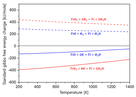 It is known that hydrogen in TiH2 is dissolved in the form of atomic hydrogen, and hydrogen is released when the phase transformation occurs from TiH2 to Ti under the dehydrogenation process. At this time, atomic hydrogen diffuses to the surface and is bonded to hydrogen molecules at the surface to be released as a gas state. Atomic hydrogen is known to have a much higher oxygen reduction driving force than hydrogen molecules [23]. If the oxide layer reacts with atomic hydrogen at the surface, the oxide layer might be reduced, resulting in a decrease in the oxygen concentration. The possibility for the reduction of the Ti oxide with the atomic hydrogen was proved through thermodynamic calculations.