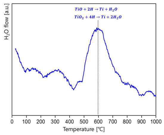 GD-MS measurement was applied to confirm whether the Ti oxides could be reduced by the atomic hydrogen. Figure 7 shows the GD-MS result, where the amount of H2O flow with respect to the temperature was measured during the dehydrogenation process of TiH2. H2O flow is detected in GD-MS during heating metal materials when H2O adsorbed on the metal surface evaporates or the oxide layer on the surface is reduced by hydrogen. Evaporation of H2O adsorbed on the surface would occur near the boiling point of water and the generation of H2O at higher temperatures would be caused by the reduction of the oxide layer.