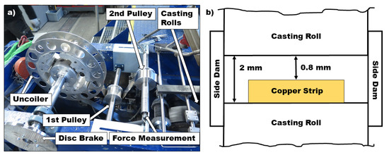 The cladding strip is inserted with the help of a feeding system. The system has three main functions. First, it provides a continuous feeding of the cladding strip. Second, it guides the cladding strip into the pool, ensuring the strip does not collide with the side dams to prevent leaking. In addition, third, it keeps the strip tension thereby maintaining the contact between cladding strip and casting roll surface constant to ensure stable process conditions and also compensates the unwinding coil. The feeding system is shown in Figure 2a. A force measurement is installed in the support of the second pulley, which records the vertical load on the support. The defined angles at the second pulley allow for the calculation of the strip tension. The brake is activated pneumatically, and, by changing air pressure, braking torque, and, therefore, strip tension can be adjusted.