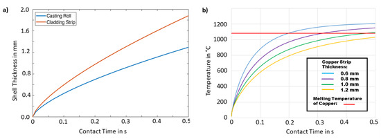 Process parameters were determined and the cladding strip thickness was selected on the basis of finite element (FE) simulations using a one-dimensional heat transfer model. Details on the model and the simulations can be found in previous works [14,16]. Contact time is the first important parameter derived from simulation results. This can be achieved with help of the shell growth (Figure 3a) by simply taking the time the solidifying shell needs to grow to approx. half the roll gap. However, here the first challenge arises. Since a strip narrower than the casting roll width was selected for easier alignment and positioning, the roll gap in the performed casting experiments possessed two different thicknesses, as schematically depicted in Figure 2b. Additionally, shell growth on the copper strip is much faster than shell growth on the casting rolls (Figure 3a) because the heat flow into the strip is much higher due to a better contact between melt and strip because of the smooth strip surface and the much higher heat transfer of copper compared with the nickel-coating of the casting rolls. This results in an unequal degree of solidification across the strip width. Furthermore, a higher degree of solidification in contact with the cladding strip leads to a higher deflection of the casting rolls; the effective roll gap widens, amplifying the effect of the unequal roll gaps and thereby affecting process stability. Therefore, a thin cladding strip thickness would be favorable in order to keep the gap difference small.