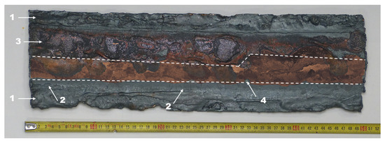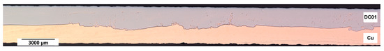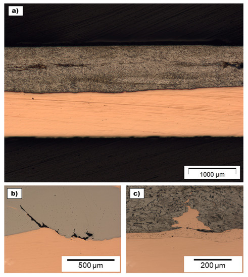 At first glance, the cross-section of the strip shows an irregular and non-uniform bonding interface, even to the naked eye, see Figure 5. Large parts of the interface present themselves as a sharp border between the two metals, a flat interface similar to the interface found in clad metals made by hot rolling [19,20]. However, in between are numerous different irregularities detectable. These irregularities can be grouped into four categories: cracks, local meltings, folds and intermixed regions.