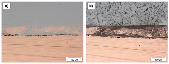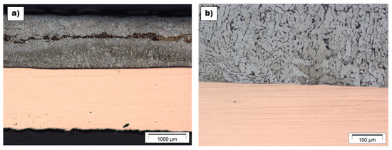 At higher magnification, a roughly 25 µm to 30 µm wide interspersed zone along the interface can be occasionally observed, see Figure 11a—here, very obviously, copper and steel mixed. Once etched (Figure 11b), a strong and sharp separation between steel and the interspersed zone is visible, suggesting that the steel melt had fully solidified and both phases were not liquid at the same time. Another indication to support this is that no copper inclusions can be found in the steel layer. The wavy character of the mixture within this zone suggests that copper had liquefied at some point during the process.