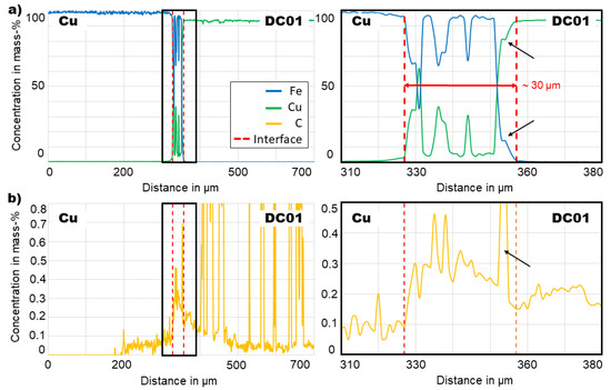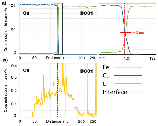 The line-scan of the carbon concentration across the interface (Figure 7b) shows a penetration depth into the copper strip of about 70–80 µm. Clearly visible is an enrichment of carbon around the bonding interface of around 50 µm in both directions. These observations are also very similar to previous studies [13] and to those made on hot roll bonded clad strips [19,20]. The manganese concentration (not depicted) seems to not be affected at all by the cladding process.