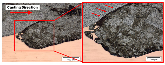 The exact formation of the intermixed region can still not be sufficiently explained by these observations. According to Ishida [21], interaction between the two metals takes place instantaneously and simultaneously. Atoms of the liquid copper diffuse into the grains of the iron via lattice diffusion. This is visible in the micrograph as a dark edge of the steel phase, which can be seen in Figure 9 and Figure 10 but is not present at the intermixed region. Parallel iron dissolution, as described by Yoshida [24] and also observed by Ishida [21], takes place. However, this usually includes a degeneration of the interface and in opposition to their findings a sharp interface between steel and intermixed region with no visible degradation is present in the microscopic imagery (Figure 11). Therefore, further research is needed.