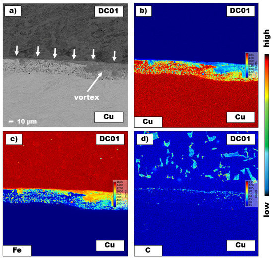 The imagery and measurements from the electron microprobe analyzer (Figure 12 and Figure 13) is examined in purpose to gain a better understanding about the formation of the intermixed region. In the image taken by the scanning electron microscope (SEM) (Figure 12a), the intermixed region is clearly distinguishable. Looking more closely, two conspicuous features can be seen. The first one are spherical inclusions in the copper. This is the form in which iron typically segregates in a copper-rich phase [23]. This corresponds with the element mapping for copper and iron (Figure 12b,c) and the images from the microscopy (Figure 11). Second, directly at the edge between steel layer and intermixed region, a narrow band of a different color than the grey of steel and of copper is visible (marked in Figure 12a). This band widens towards the right side of the image into a vortex. This seems like an iron-rich phase (Figure 12c) in which carbon agglomerates noticeably (Figure 12d).