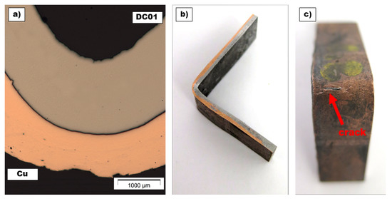 All bending samples, both as-cast and cold-rolled, were bent to an angle of 90° for a bending radius of 5 mm without delamination, see Figure 17a,b. In the bending area, a local thinning of the copper layer is visible. In Figure 17c, one can see a crack opening in the copper layer, which might be the result of work hardening. However, still the bond did not fail. These results support the impression of the rolling experiments of a good and moldable material bond.