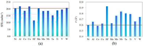 As shown in Figure 1a, the SFE0 for Ni58Cr32Fe10 is 20.5 mJm−2. The addition of Mn and W leaves the SFE0 almost unchanged. Al and Cu increase the SFE0 at scales of 1.4 and 1.3 mJm−2, respectively. All other elements decrease the SFE and these elements can be ordered in terms of SFE decreasing scales: Hf (9.0 mJm−2) > Ta (5.2 mJm−2) > Mo (2 mJm−2) = Nb (2 mJm−2) > Co (1.9 mJm−2) > Ti (1.6 mJm−2) > V (0.9 mJm−2).