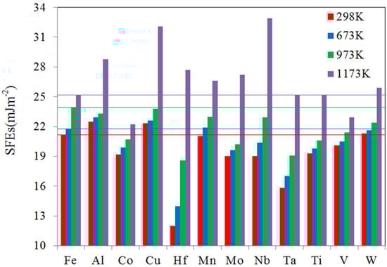 In Figure 2, the SFEs (sum of chemical and magnetic contributions) at 298 K are exhibited with red rectangles, and the SFE value of Ni58Cr32Fe10 is marked out with a red line. At 298 K, the SFEsmag are so small (<1 mJm−2) in all of the alloys considered in this paper that the SFEs exhibit almost the same trend as the SFEs0. The addition of Mn and W leaves the SFE almost unchanged, while the addition of Al and Cu increases the SFE at scales of 1.3 and 1.1 mJm−2, respectively. All other elements decrease the SFE and these elements can be ordered in terms of SFE decreasing scales: Hf (9.2mJm−2) > Ta (5.4 mJm−2) > Mo (2.2 mJm−2) = Nb (2.2 mJm−2) > Co (2 mJm−2) > Ti > (1.9 mJm−2) > V (1.1mJm−2). Experiments at room temperature demonstrated that Hf, Mo, Nb, Ti, and V could decrease the SFEs of Alloy 690 [].