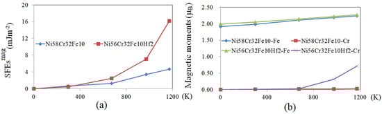In Figure 3, Ni56Cr32Fe10Hf2 was chosen as an example, as the addition of Hf causes the most significant SFE reduction in the temperature range from 0 to 973 K, but causes a significant SFE increase at 1173 K. Previous study on austenitic stainless steels revealed that SFEmag exhibits a linear feature in the temperature range from 0 to 400 K []. Our results show that, in Ni58Cr32Fe10, SFEmag exhibits an almost linear feature in the temperature range from 0 to 1173 K, as shown in Figure 3a. However, SFEmag in Ni56Cr32Fe10Hf2 only exhibits a linear feature in the temperature range from 0 to 673 K. Considering that SFEmag is a local magnetic moment-related parameter, we plotted the local magnetic moments of Ni58Cr32Fe10 and Ni56Cr32Fe10Hf2, as shown in Figure 3b.