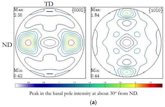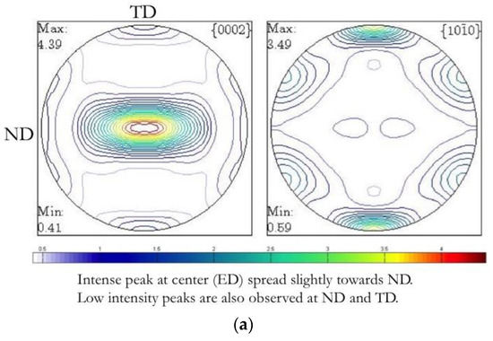 XRD pole figures measured on the three planes, ED-ND, ED-TD, and TD-ND orientations are shown in Figure 3a–c, respectively. Figure 3a shows that a strong basal texture is formed during the extrusion of ZK60-T5 alloy, which consists of the basal planes {0001} parallel to the ED-TD plane and <100> direction along ED. The basal pole intensity is about 12.6 times the random, which may be termed as a strong texture. Figure 3b (ED-TD plane) presents a strong ellipsoidal basal texture, suggesting that the basal planes are parallel to ED-TD plane and are tilted with a spread around ND. Figure 3c (ND-TD plane) confirms the above observations on texture.
