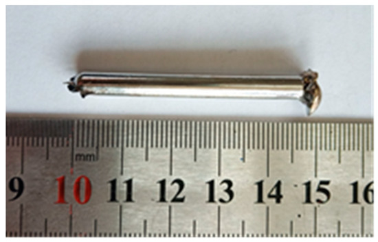 The arc-melted alloy was loaded into a quartz crucible with a hole (about 1 mm diameter) in the center of the base, which was then placed into a single roll melt-spinner. The top end of the crucible was connected with the high-pressure gas line. The copper roller for melt-spinning was removed and replaced by the copper mold. During the casting process, the crucible had two fixed working positions for melting and ejecting the liquid alloys. Therefore, before evacuating the chamber, the crucible was adjusted to the appropriate position to make sure that during the heating step, the section of the crucible with the alloy was surrounded by the radio-frequency (RF) coil and, during the ejecting step, the bottom of the crucible was right above the copper mold with the distance being about 0.3 mm. The system was then evacuated to a pressure of 3 × 10−3 Pa for induction heating. A reflective mirror, in line with the axis of the crucible, was fixed on the top of the instrument to determine the melting process of the alloy. Once the alloy was melted, the crucible was instantly dropped down to the “ejecting position” and the melt was rapidly ejected into the mold immediately with high-pressure argon. A series of cylindrical alloy rods with a diameter of 5 mm and a length of 10 mm were fabricated, as is shown in Figure 1.