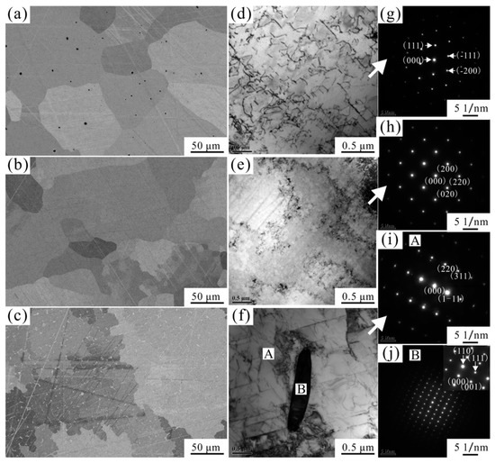 (a–c) SEM micrographs of the V0.0, V0.25, and V0.5 rods, respectively. (d–f) TEM micrographs of the V0.0, V0.25 and V0.5 rods, respectively. (g–j) TEM selected area diffraction patterns corresponding to (a), (b), and the phases marked as A and B in (f), respectively. The white flake phase that first formed in the V0.5 alloy (c) was identified as the σ phase. The straight lines in (a–c) are the stretches and the black spots in (a) are the surface contaminants introduced during the polishing process.