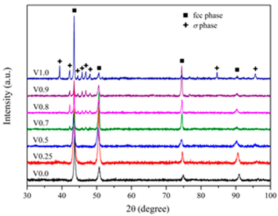 Figure 5 is the XRD diffraction patterns of the CoCrFeNiVx alloys. It indicated that, for the alloys with a low concentration of V element (x ≤ 0.5), it is mainly composed of the single fcc phase. For the alloys with x ≥ 0.7, the σ phase with a tetragonal crystal structure was observed. This is consistent with the studies by Salishchev et al. [29], who also observed the existence of the σ phase in the as-solidified equal-atomic CoCrFeNiV HEA. Figure 5 shows that the peak intensity for the σ phase was enhanced along with the increase in the V concentration. Moreover, there was a significant shift of the diffraction peak of {111} crystal plane from 43.64° (CoCrFeNiV0.25 alloy) to 43.50° (CoCrFeNi alloy), implying a lattice expansion of the fcc phase caused by the V element. In addition, the peak intensity of the {111} crystal plane of the fcc phase in the V0.9 alloy was not the strongest one in the diffraction patterns, which might be due to the existence of the preferential grain orientation in the as-solidified bulk metallic materials [32]. In fact, the σ phase was formed first in the V0.5 alloy, according to the microstructure presented in Figure 2. The deviation of phase identification by XRD analysis is due to the observed low fraction of the σ phase in the V0.5 alloy.