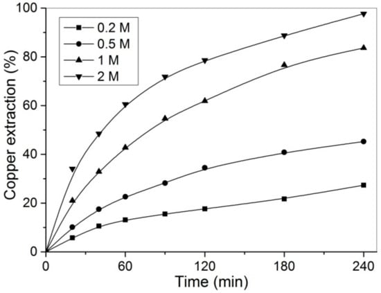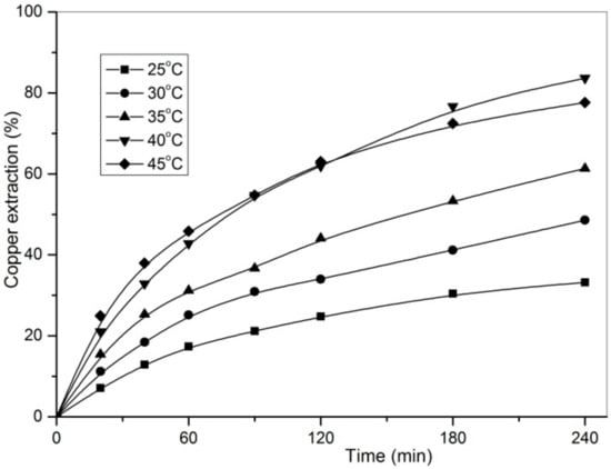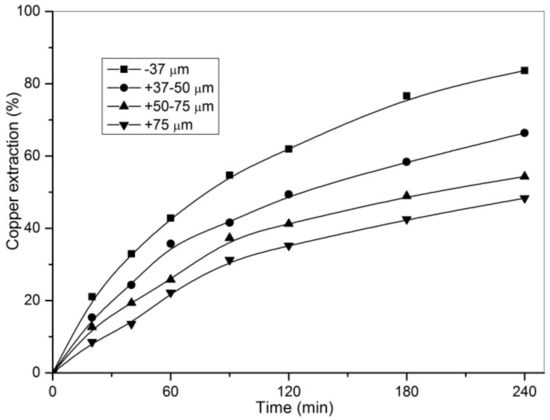 As can be seen from Figure 3, with decreasing particle size, copper extraction under the same conditions increases. The similar results were obtained by other authors [,,]. The contact surface between oxidant and chalcopyrite increases, for smaller particles compared to large ones, significantly improving copper extraction; thus, particles with size −37 µm was used for testing other parameters.