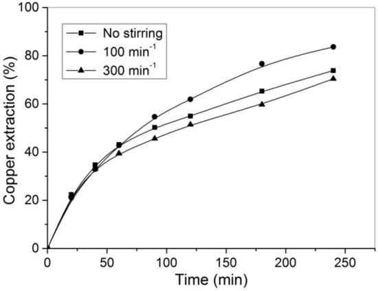 A similar result was obtained by Hu et al. [], who confirmed that the copper dissolution increased slowly with increasing stirring speed up to 200 rpm, after which it does not change.
