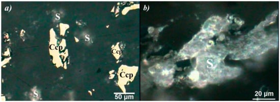 Optical micrograms of the leach residue for different temperatures of leaching (particle size −37 µm, stirring speed—100 rpm, time—240 min, solid/liquid ratio—2 g/dm3, —1.5 M H2SO4, —1 M H2O2): (a) temperature 25 °C, (b) temperature 40 °C.