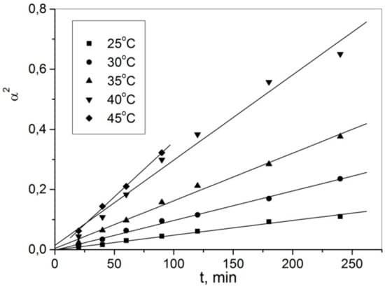 In order to determine the activation energy, Equation (5) was used for the linearization of the kinetic curves from Figure 4. The variation in α2 = kt with time at different temperatures is shown in Figure 10.
