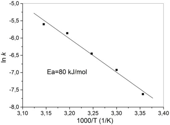 The activation energy was calculated from the slopes of the lines in Figure 10; for the chalcopyrite oxidation in the H2SO4-H2O2-H2O system, activation energy is 80 kJ/mol (Arrhenius equation k = A·e–Ea/RT was used—Figure 11).