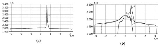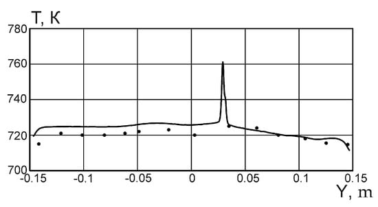 Figure 12 shows the results of comparing the calculated and experimental data on the graph of the distribution of the averaged temperature over the diameter of the bath near the surface of the melt. In this graph, the average deviation of the experimental and calculated data does not exceed 10%.