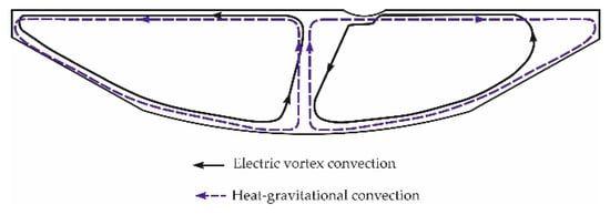 Figure 4. It can be seen that the electric vortex and naturally convective flows were contradirectional in the area of the electric arcs, and the directions of the electric vortex and the heat-gravitational convections coincided in the area of the bottom electrodes.