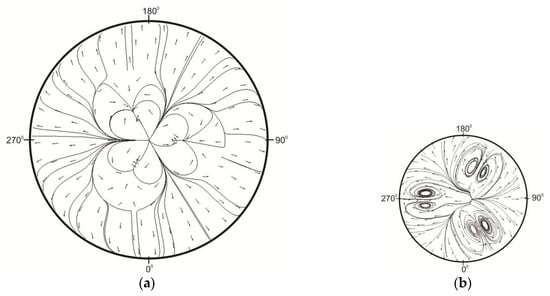 vφ was about 1.1 m/s (in 83°, 95°, 203°, 215°, 323°, and 325°). The sign reversal for the azimuthal velocity corresponded to the flow divergence areas near coordinates 90°, 210°, and 330° and to the flow convergence areas near coordinates 30°, 150°, and 270°.