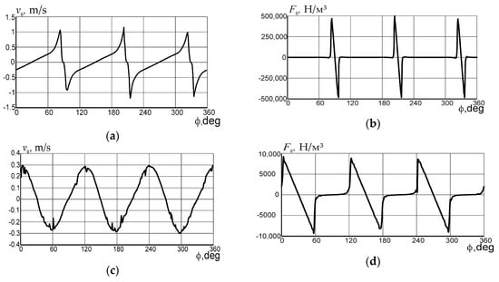 vφ reached 0.3 m/s near the lateral surfaces of the bottom electrodes (near coordinates 0°, 60°, 120°, 180°, 240°, 300°, and 360°). The flow divergence areas corresponded to coordinates 90°, 210°, 330°, and the flow convergence areas corresponded to coordinates 30°, 150°, 270°.