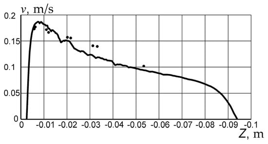 Figure 10 shows a comparison of calculated and experimental data on a graph of the velocity distribution over the depth of the bath along its axis. As can be seen,