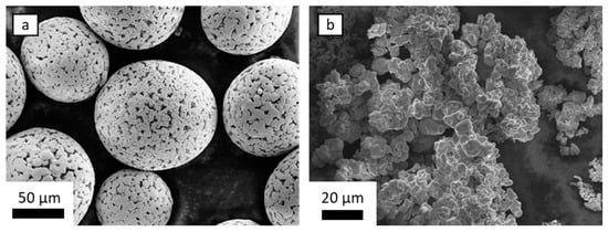 Commercially available pure elemental powders were used as a starting material: Fe (MaTeck, Jülich, Germany, 99.9%, −100 + 200 mesh), Co (Goodfellow, Hamburg, Deutschland, 99.9% 50–150 μm), high purity Co (Alfa Aesar—Puratronic, Ward Hill, MA, USA, 99.998%, −22 mesh), and Cu (Alfa Aesar, Ward Hill, MA, USA, 99.9%, −170 + 400 mesh). The reason for using two grades of Co powder was the following: although the diameter of the particles of the less pure powder is rather large, the grains are small, meaning HPT deformation of high Co containing materials became difficult. For comparison, scanning electron micrographs of both types of Co powders are presented in Figure 1. Description of the other powders used is given in reference [40].
