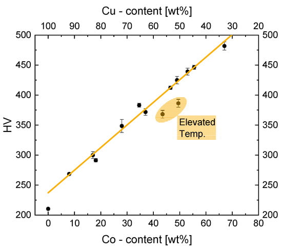 A typical feature of HPT-deformed materials is an increasing hardness and decreasing microstructural size with an increasing distance from the sample’s center. As soon as a microstructural saturation is reached, the hardness does not increase further [32]. For a valid comparison of samples of varying Co-content (Figure 2), Vickers hardness values were taken from the saturation region of constant hardness. Measurements within these regions show a clear trend of increasing hardness with increasing Co-content. Figure 2 was drawn using samples from this work and data from samples presented in reference [40]. The trend breaks down for pure Co of highest purity, whose hardness was found to be 368 HV. In the latter case, neither impurities (as would be the case for the less pure Co-powder) nor another element obstruct grain boundary motion; the grains are larger and the material becomes softer.