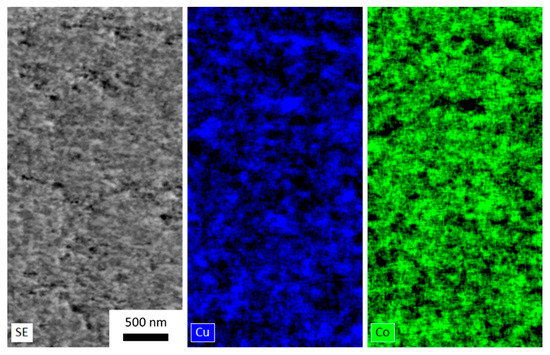 At room temperature and for 200 °C deformed samples, the microstructure appears to be homogeneous on a scale of ~1 μm, while the microstructure for the samples deformed at elevated temperature (Figure 3c) and 300 °C (Figure 3f) appears to be granular. EDX measurements of the sample presented in Figure 3c) using low energy electrons (5 kV, smaller excitation volume) show changes in the chemical composition at the same length scale (Figure 4). The small sample Cu49Co51 (200 °C deformation temperature) does not show this segregation of Co. Therefore, the microstructure of the large sample resembles more like the one of the Co-rich Cu22Co78, which experienced a deformation temperature of 300 °C.