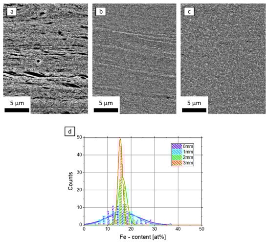 For the determination of the actual chemical composition and elemental distribution of the deformed samples and to detect possible deviations from the nominal composition of the powder mixture, several EDX spectra were recorded at large radii, and their mean values are presented for the chemical composition in Table 1. To demonstrate the good co-deformation and the increasing intermixing with high applied strains, 60 EDX spectra were recorded right at the center and at radii of 1, 2, and 3 mm. As an example, the sample Cu85Fe15 was used. In Figure 5a, it can be seen that still some Fe-particles (dark particles) can be found for small radii (r = 0 mm, r = 1 mm) and the distribution of results of EDX-analysis (Figure 5d) is widespread (blue lines), due to the existence of Cu-rich and Fe-rich regions. For r = 2 mm and r = 3 mm, the distribution become narrower, demonstrating improved intermixing of Cu and Fe on the scale of the EDX-analyzed volume. This is also confirmed by micrographs in Figure 5b,c.
