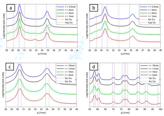 Regarding the results from synchrotron X-ray diffraction measurements (Figure 6), the low Co-containing sample (Cu81Co19) shows pure fcc phases for large radii. Diffraction lines from hcp-Co, still visible e.g., at a radius of 1 mm, vanish for higher applied strains. For high Co-contents (Cu22Co78), where deformation was possible to be performed at 300 °C, there are still hcp-Co particles remaining for large radii, as can be seen e.g., by a shoulder in the diffraction peak at q ~29 nm−1. Nevertheless, a solid solution of the two elements can be seen for both samples. The lines are not at their nominal position for pure elements, but slightly shifted to the right (from Cu towards fcc-Co, for low-Co concentration) or to the left (from Co towards Cu, for high Co concentration). The situation is different for the Cu55Co45 sample. Here, the diffractogram is dominated by very broad peaks—especially for higher q-values, which can be easily explained by overlapping peaks at (or close to) the original position of Cu and fcc-Co.