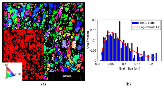 Further microstructural investigation, using TKD, was made for Cu55Co45 to obtained deeper insights into the as-deformed microstructure. As an example for TKD results, Figure 7a is shown. Although the hcp-Co phase was searched for, there are no clear indications of hcp-Co grains of detectable size. Distinction between grains rich in fcc-Co and rich in fcc-Cu cannot be made since the difference in lattice parameter is too small. Identified grains are in the 100 nm regime and a texture analysis, which is not shown here, yielded the shear texture typical of fcc metals [52]. In total, four scans were made, and their aggregated area weighted grain size distribution f(d) was fitted by a lognormal distribution.
