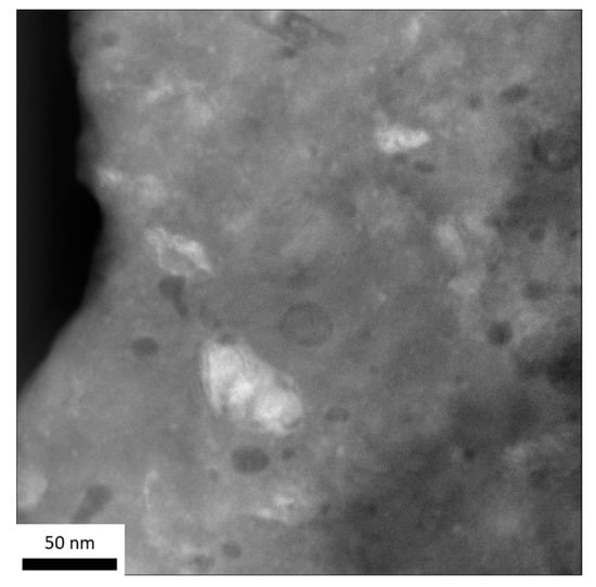 High angle annular dark field (HAADF) image of Cu55Co45, using the same specimen, which was used for deriving the results shown in Figure 7. The Co-particles (dark regions) with a size of several tens of nanometers become visible.