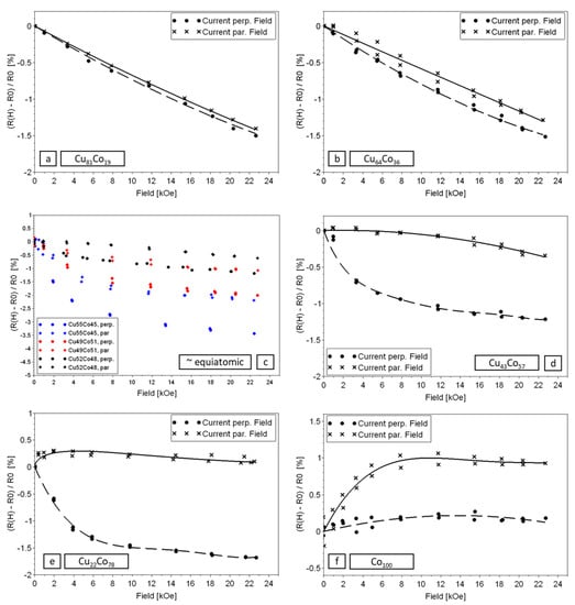 For small Co-content, an almost isotropic dependence of resistance with magnetic field can be found (Figure 9a,b). With increasing ferromagnetic content, there is a gradual development of an anisotropic component, which is due to larger, percolating ferromagnetic regions. Thus, for medium and high ferromagnetic content, the resistance curve can be seen as a superposition of GMR and AMR. Pure Co (Figure 9f) is the best example for AMR with the resistance being higher for parallel current and magnetic field. For pure Co, the difference in resistivity between parallel and perpendicular orientation increases quickly for small fields; for higher fields, the curves are about parallel.