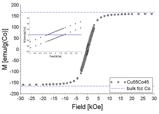 Hysteresis loop (specific magnetic moment versus applied field) of Cu55Co45, measured at 300 K, with the inset showing a detailed view for lower applied fields. For comparison, the magnetic moment of fcc-Co (164.8 emu/g [53]), is indicated as a dashed line.