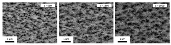 SEM—backscattered electron detection mode (BSE) micrograph of Cu55Co45, deformed with the large HPT tool at elevated temperatures. Micrographs were taken in tangential direction and for increasing radius (r = 5 mm, 10 mm, 15 mm) from left to right.
