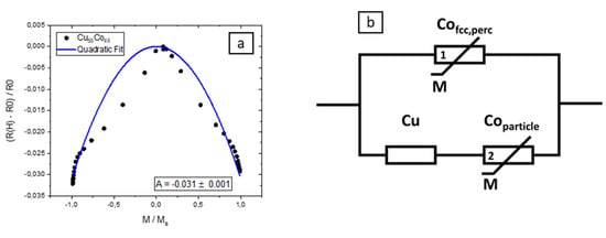 SQUID measurements (Figure 11) show that the magnetization is almost fully saturated in fields of about 20 kOe and thus the approach of drawing the change in resistivity versus relative magnetization according to reference [4] can be followed. A quadratic fit of relative resistivity drop as a function of M/Ms (Figure 13) yields a proportional constant A of −0.031. This value is lower than the one stated in reference [4], who used magnetron sputtered Cu84Co16, resulting in a value of −0.065 at a temperature of 5 K. The shape of the two MR-curves for this composition (Figure 9c) can be explained by a parallel connection of varistor-like components as shown in Figure 13b). On the one hand, there is conduction in the Cu phase, where small Co particles can be found. On the other hand, there is conduction in the partially percolating Co-phase, which gives rise to an anisotropic behavior. Both pathways have individual dependencies on the direction of applied magnetic field. The strength of both resistive branches determines the sign and magnitude of the proportional constant A.